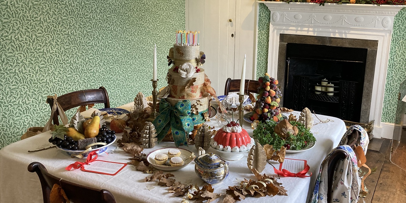 In the Dining Room, the table will be set for a festive feast, complete with a birthday cake befitting Jane Austen’s 250th birthday, and foodstuffs that we know Jane Austen loved.