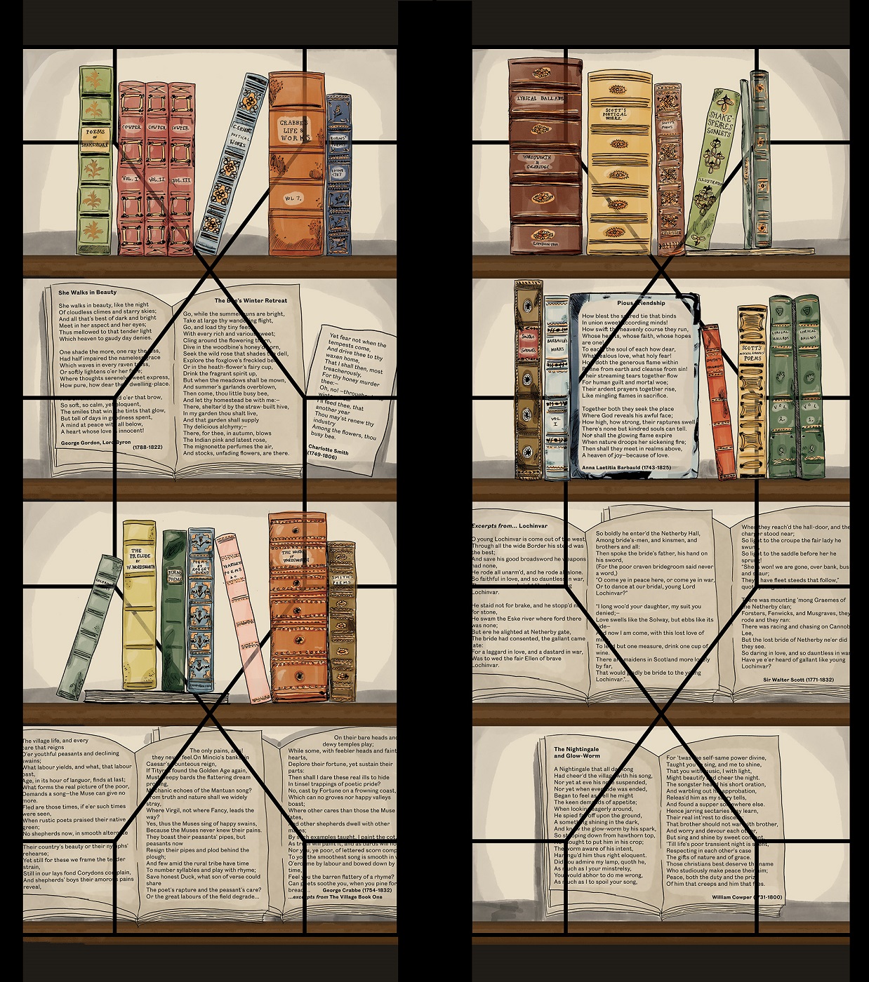 Mock up of the artwork for The Poetry Bookcase, showing the glass panes of the bookcase doors. Artwork by Jessica Hamshaw.