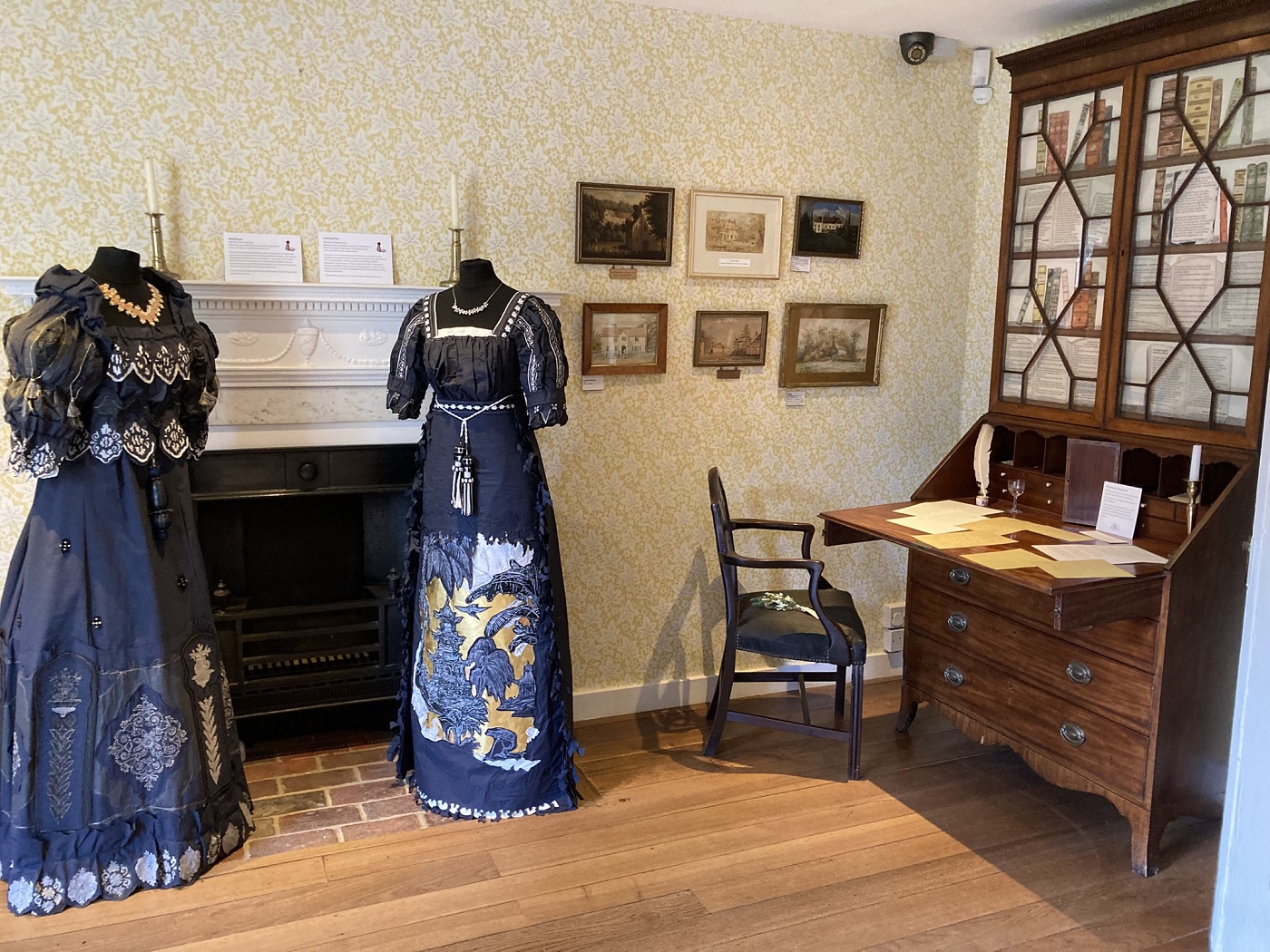 The Drawing Room at Jane Austen’s House, showing The Poetry Bookcase and two dresses from The Regency Wardrobe collection, also on display.