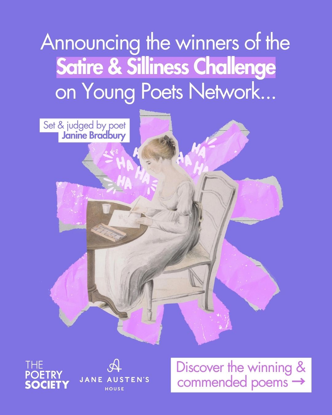 We are delighted to announce the winners of our 'Satire and Silliness' Poetry Challenge, set in collaboration with Young Poets Network and poet Janine Bradbury.As part of our ‘Persuasion & Poetry’ Festival in September we teamed up with Young Poets Network and poet Janine Bradbury to launch a poetry challenge for young people. Our ‘Satire & Silliness’ challenge asked young poets to take inspiration from Jane Austen’s signature sense of humour and write poems to make a reader laugh.