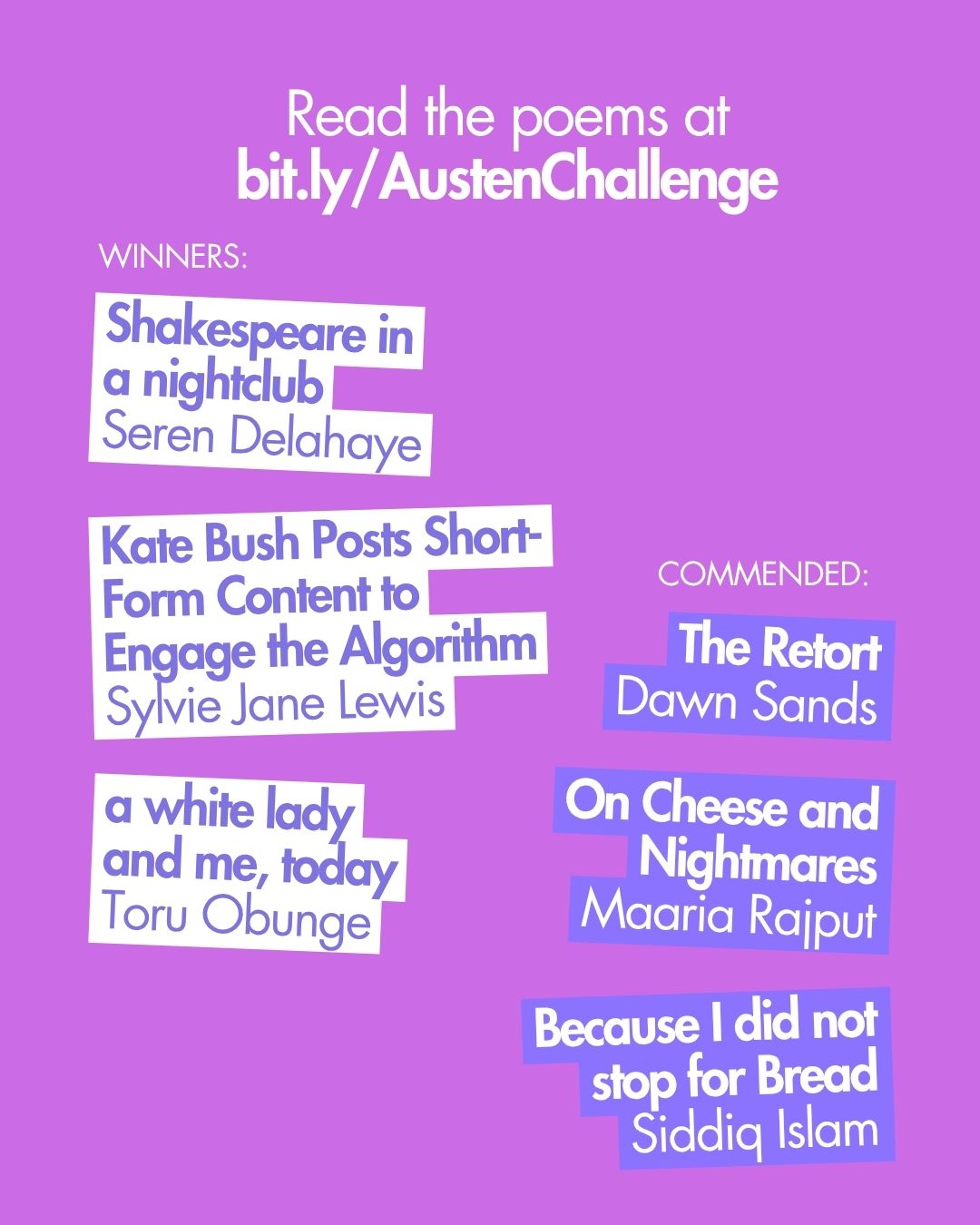 Congratulations to the winning and commended poets, and well done to everyone who entered the challenge!