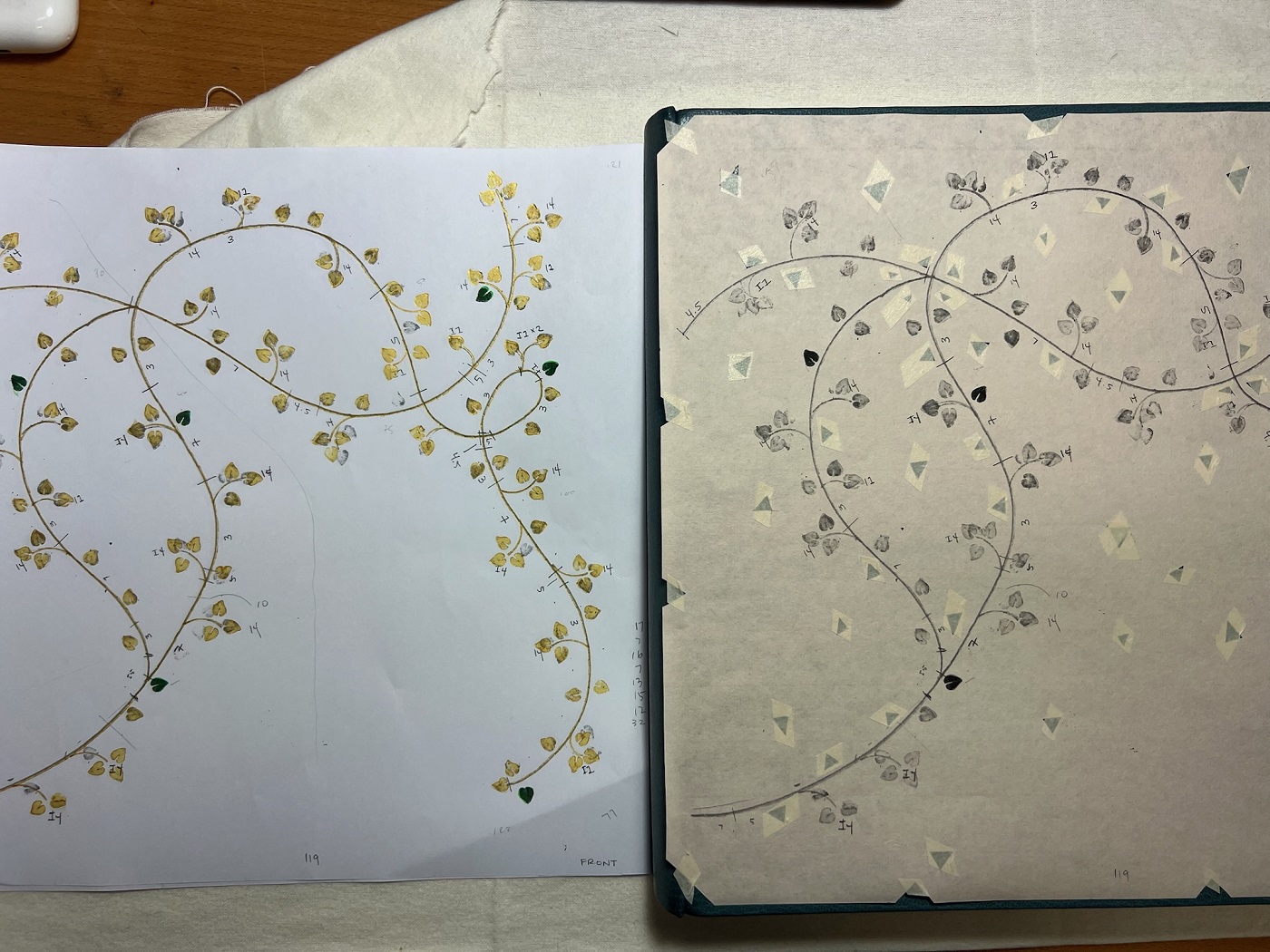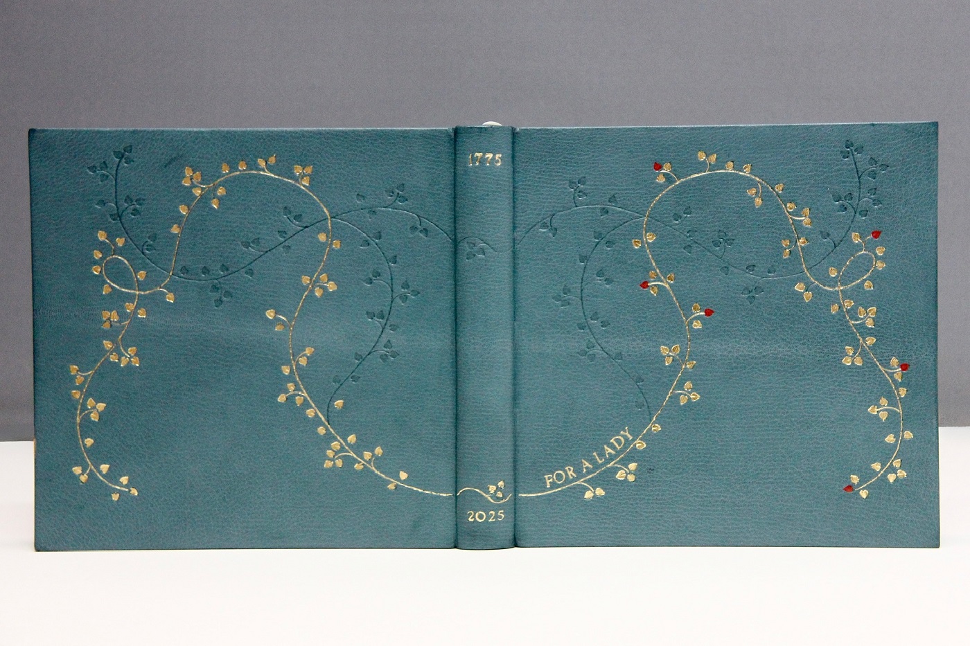 The colour scheme began with a rich teal-blue goatskin leather, a shade reminiscent of calm elegance and Regency refinement. On the surface, I hand tooled 250 leaves, each representing a year of Austen’s enduring legacy. Winding through the leaves is a single gold vine, a gold line of authorship that continues to inspire readers, authors and dreamers.