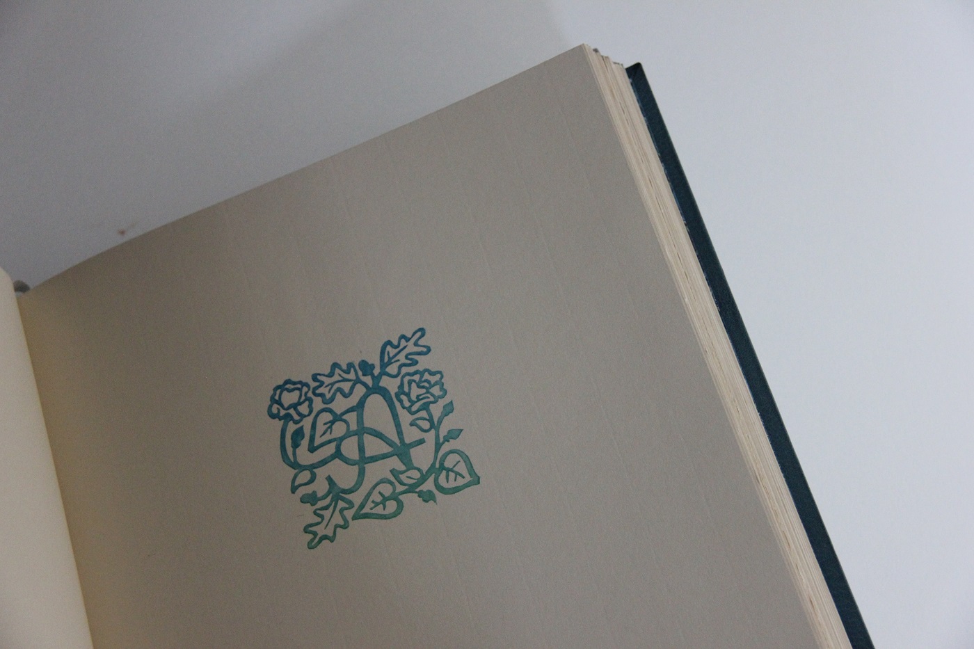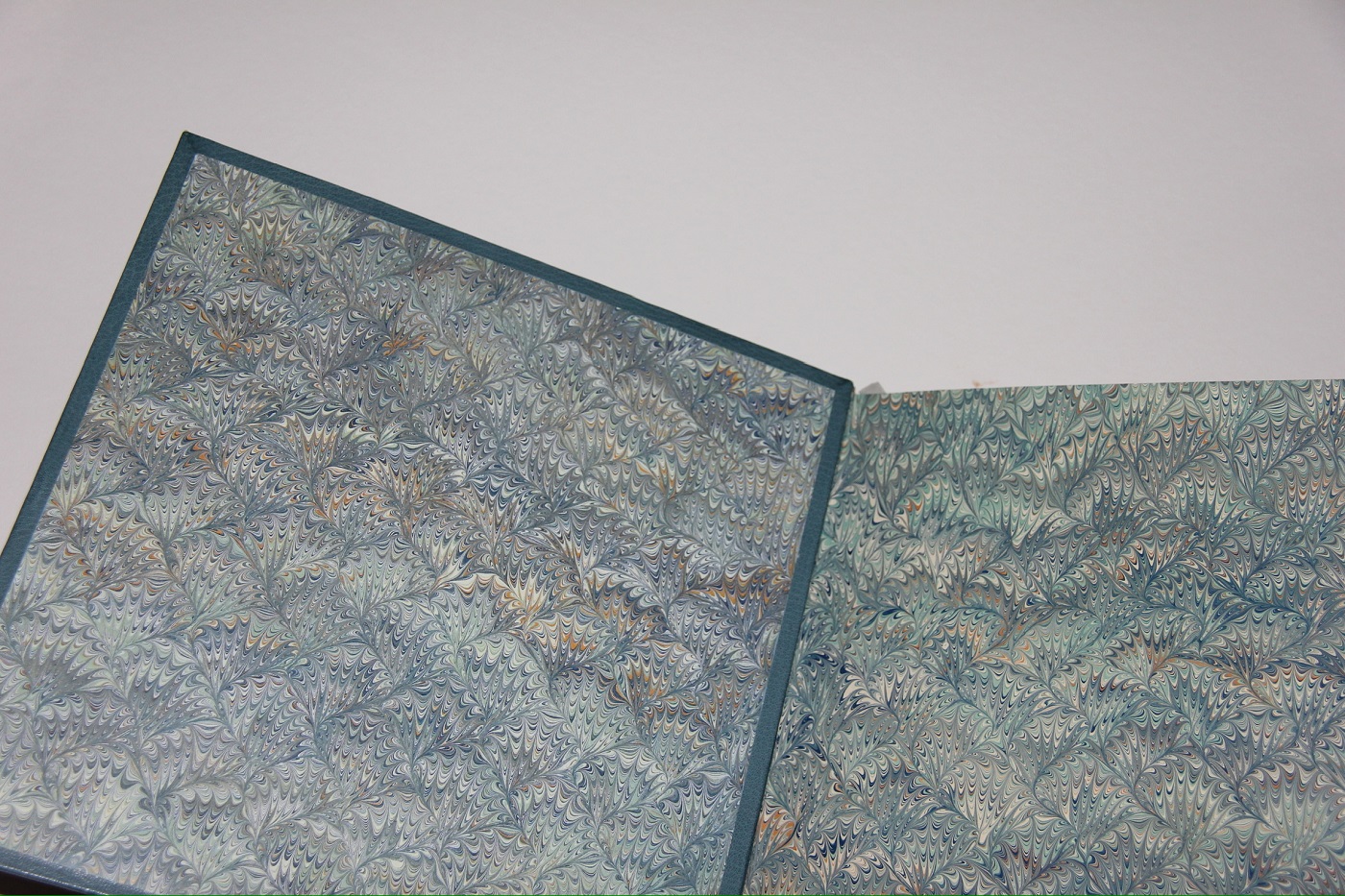 Hand-sewn endbands in silk thread, in teal blue with a stroke of gold, a subtle detail that ties the entire colour palette together in traditional flourish.