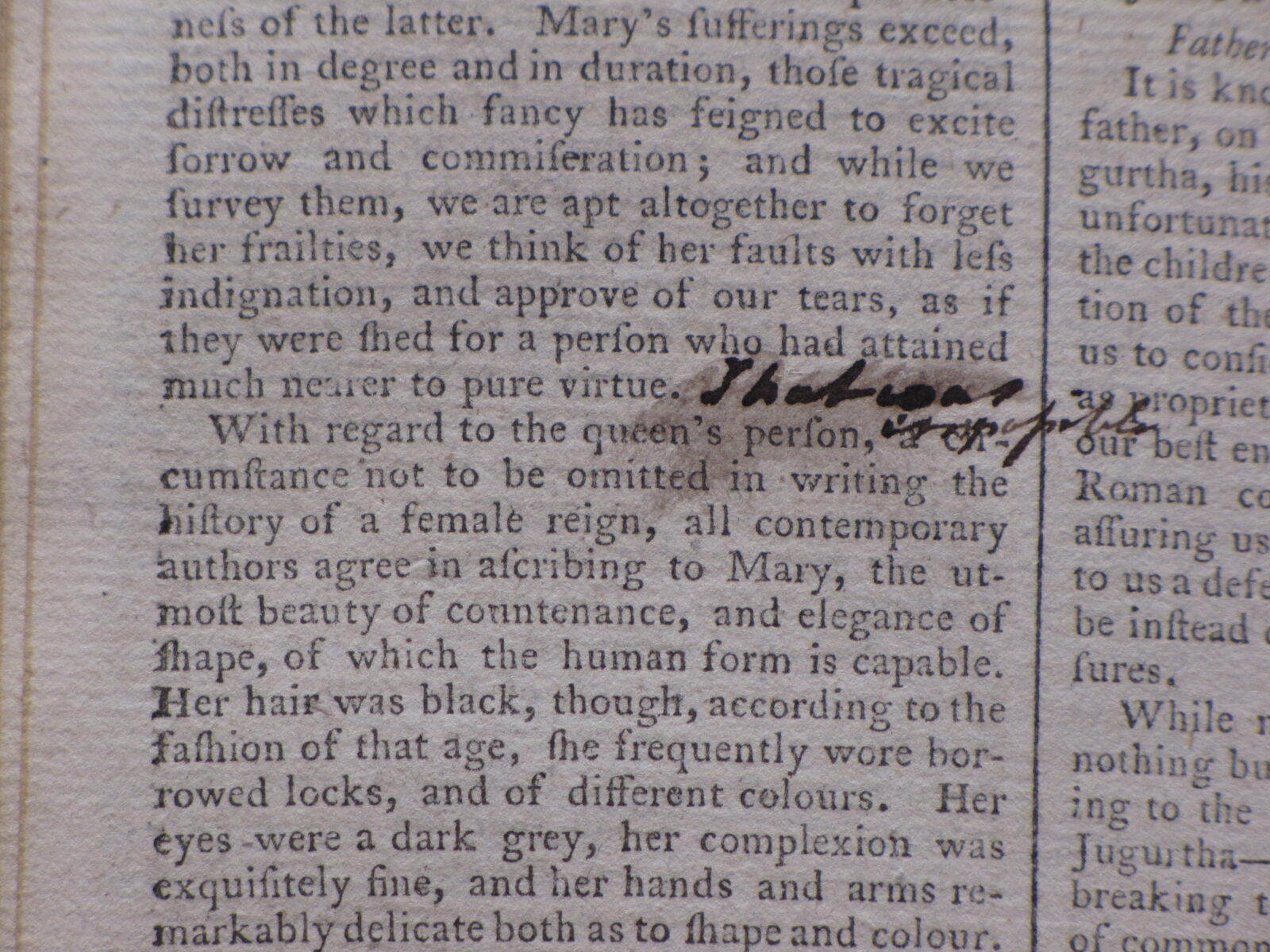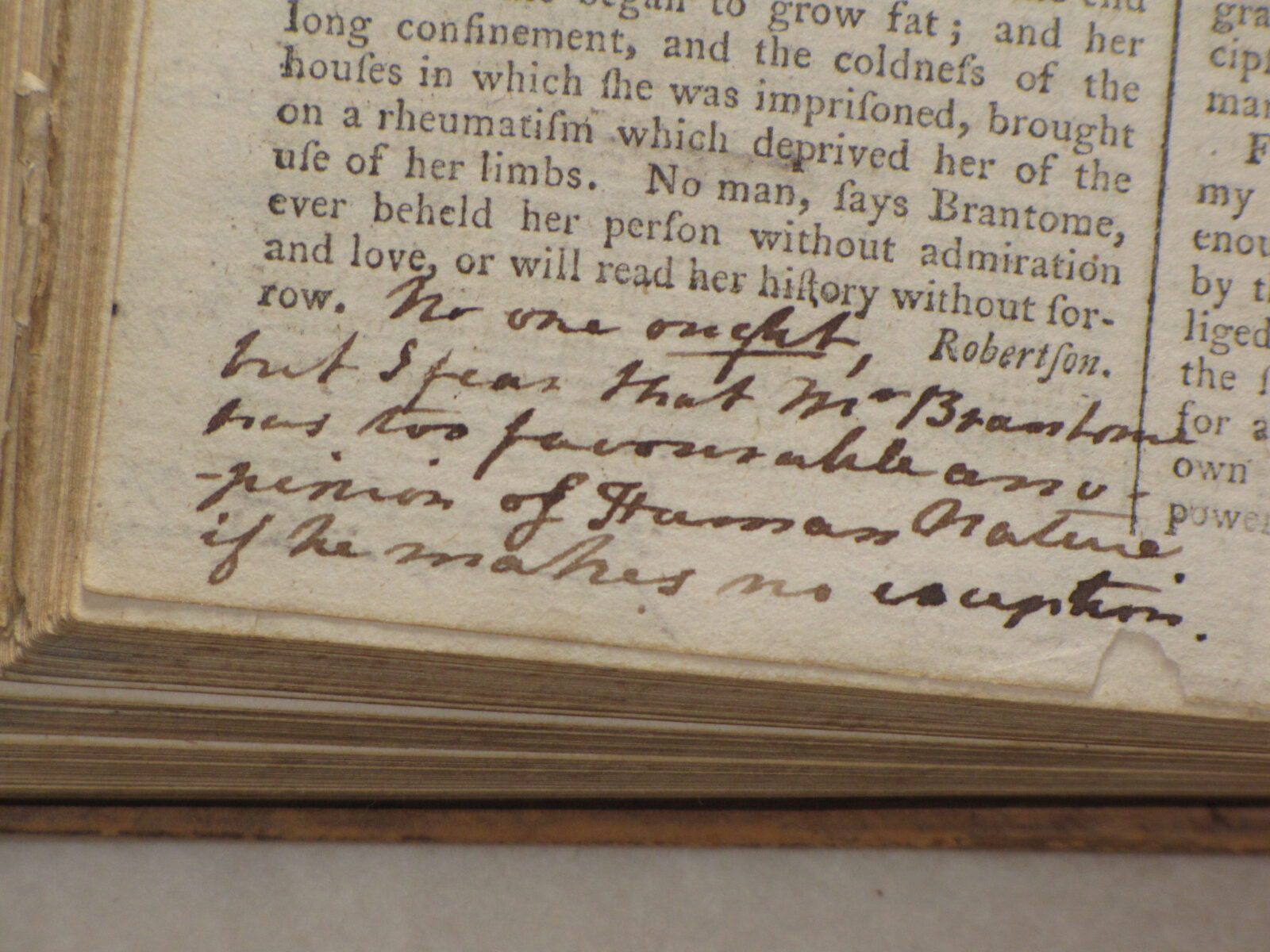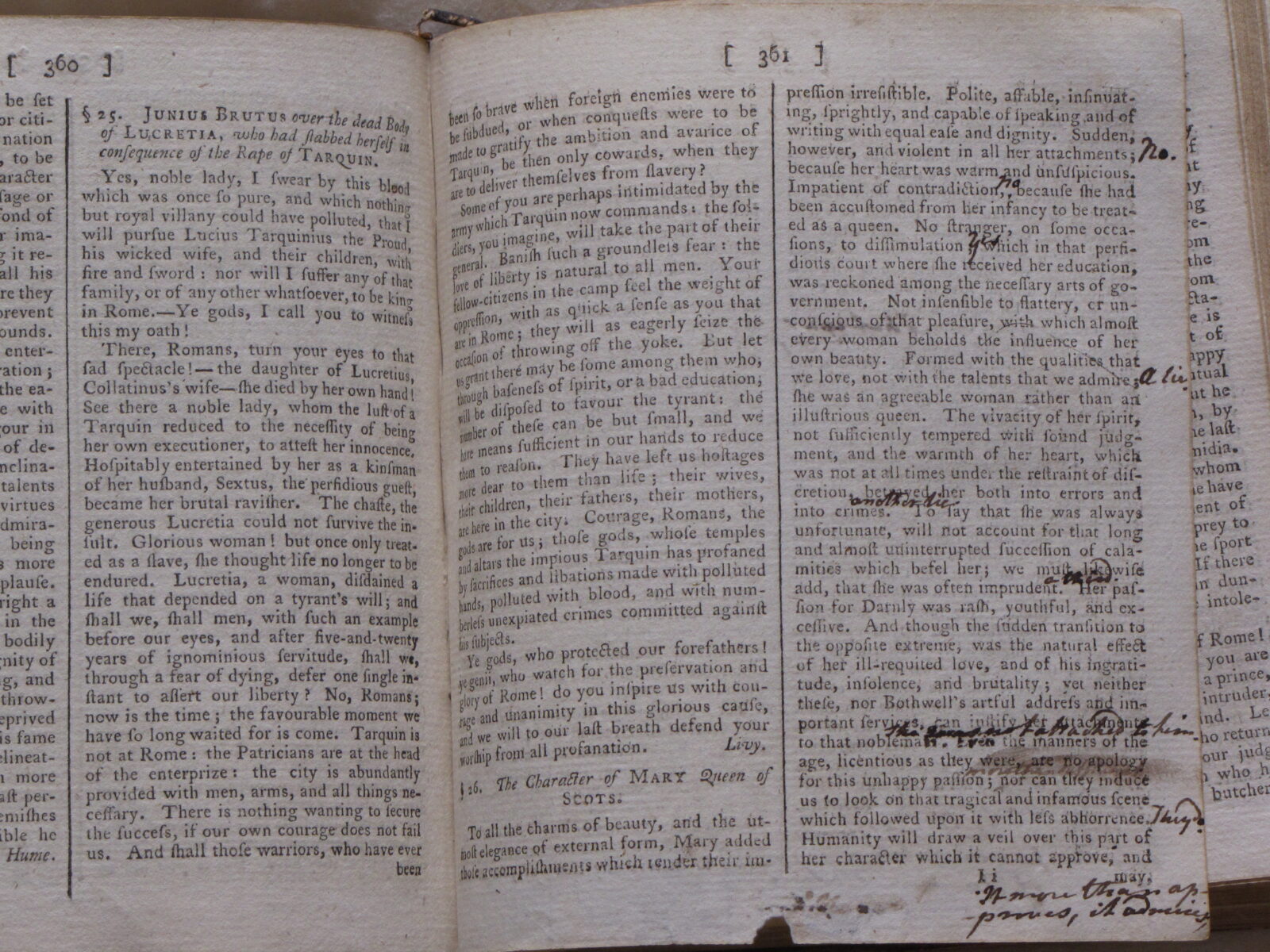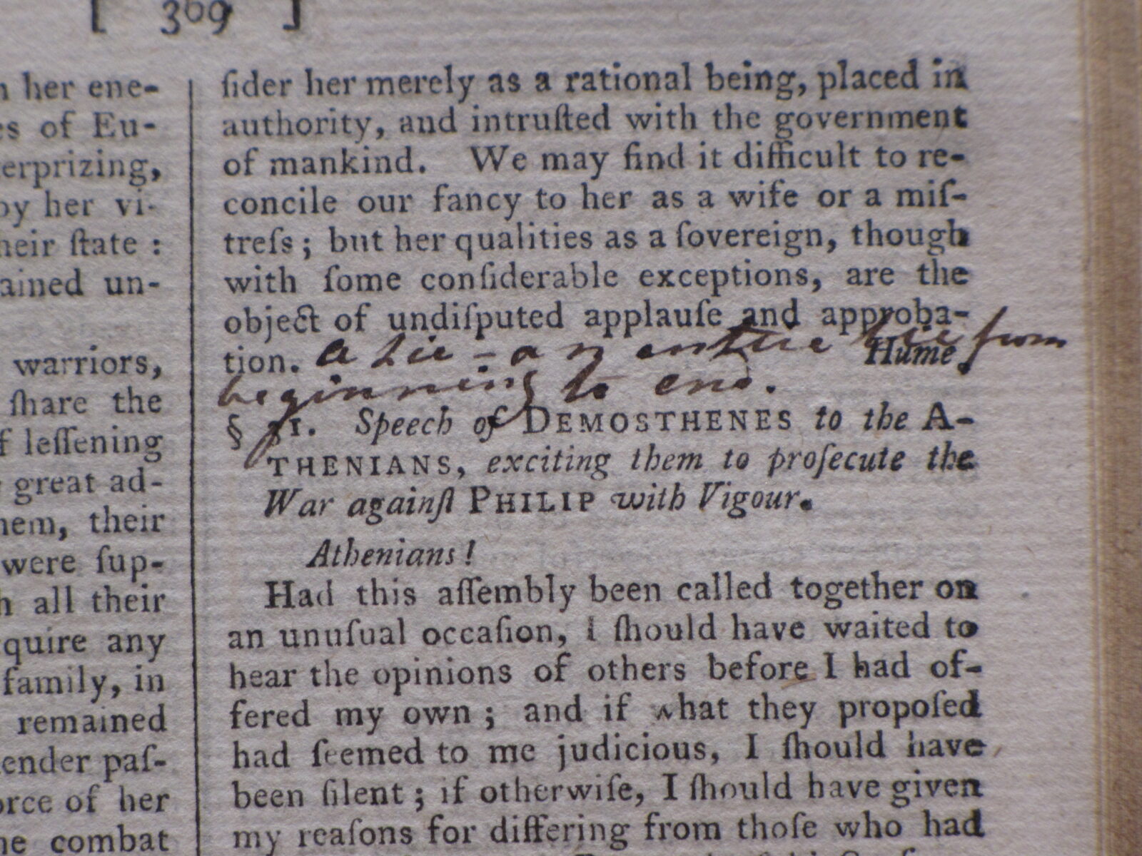 Giving Elegant Extracts to Anna may reflect Austen’s desire to educate her young niece. This copy has some comments by Austen on passages from Hume’s History of England and Robertson’s History of Scotland. Austen was a fan of the Stuarts, and she agreed with Robertson’s praise of Mary, Queen of Scots, while disapproving of Hume’s praise of Elizabeth I (“A lie—an entire lie from beginning to end.”) There are ink Xs next to passages from Hugh Blair’s Sermons on piety, sincerity, truth, and good conduct that may have been written by Austen as well. The text has many pencil marks on passages about literary style, which suggests that someone was studying the conventions of writing and literature with care. While it is not possible to know who made those markings—Austen, Anna, or Anna’s daughter Jemima, who was given Elegant Extracts next—this volume was well used in the education of several Austen generations.