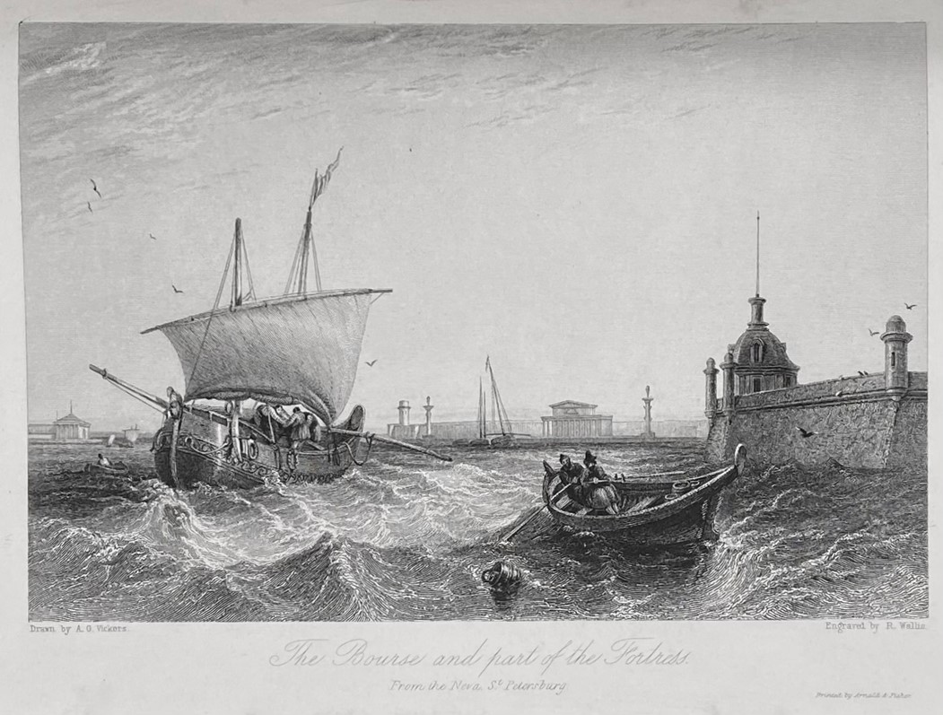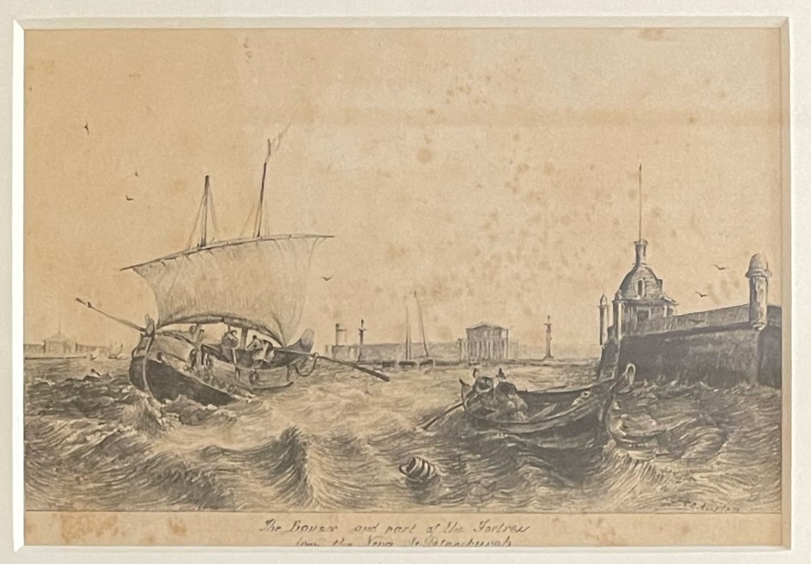 Pencil drawing by Cassandra entitled ‘The Bourne and part of the Fortress from the Neva St Petersburghâ. Inscribed at right corner ‘CE Austen’.
