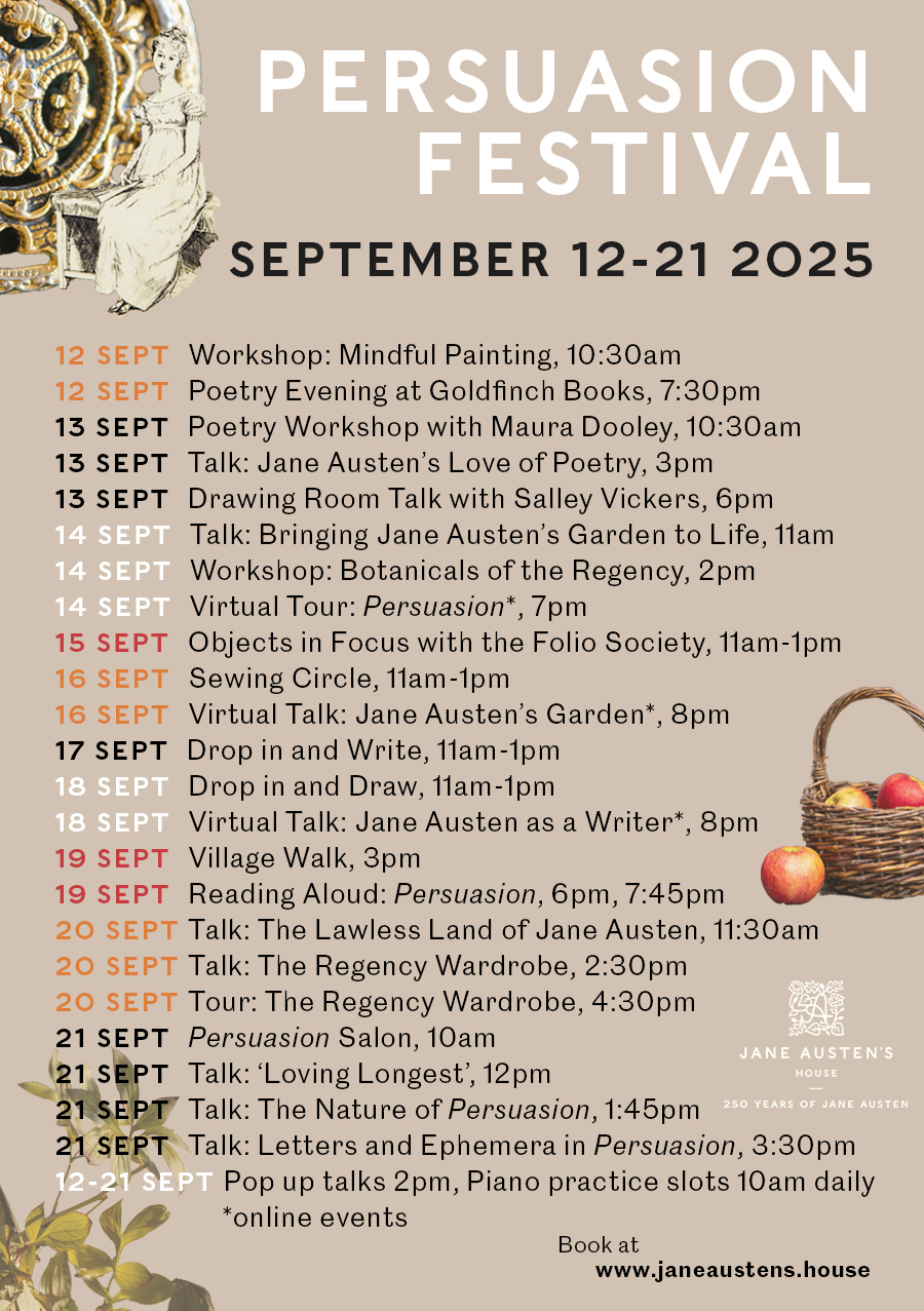 Throughout 2025, we have been hosting a series of festivals to celebrate Jane Austenâs special anniversary year. Thank you to everyone who joined us for our Pride and Prejudice Festival in January, our Spring Fling: Sense and Sensibility Festival in May, our Emma Festival in July and our Persuasion & Poetry Festival in September. Tickets are now on sale for our final festival, Jane Austen’s Birthday Celebration (12-16 December)! Each festival features a programme of special events, including themed tours, walks, performances, workshops, pop-up talks, late views and more!